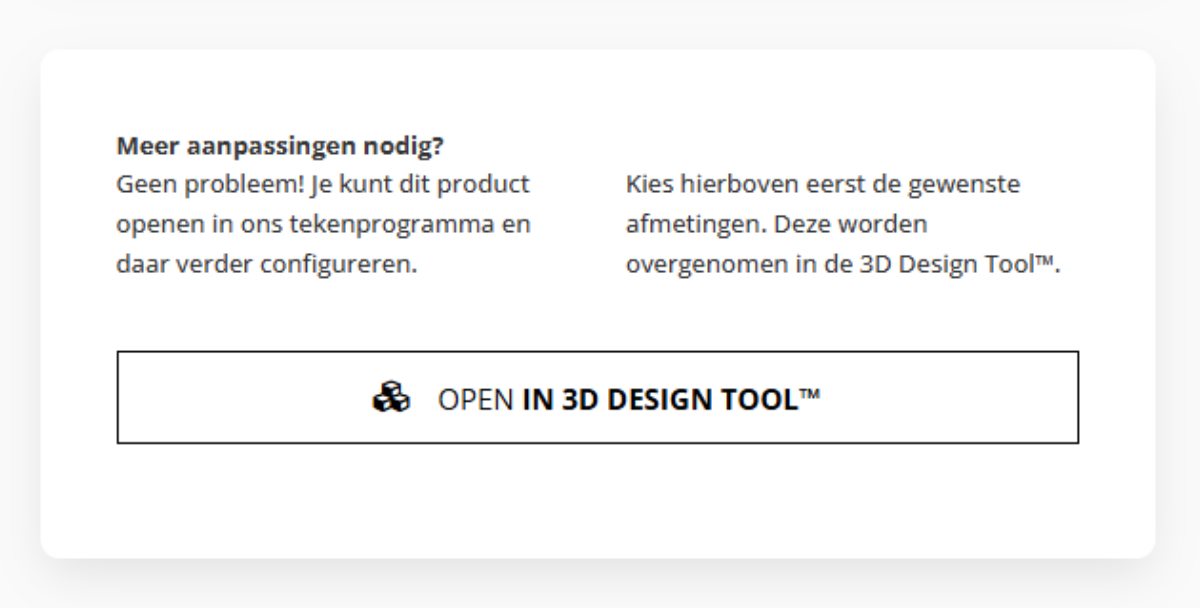 Staat jouw ideale maat of materiaal er niet bij? Of wil je net een andere vorm, bijvoorbeeld voor een meubel dat precies tussen twee muren moet passen? Dan kun je het meubel openen in onze 3D design tool. Hiermee kun je het ontwerp volledig aanpassen aan jouw wensen. Je kunt zelf de maten wijzigen, de buisdiameter aanpassen of extra onderdelen toevoegen, zoals voetplaten of wandsteunen.
