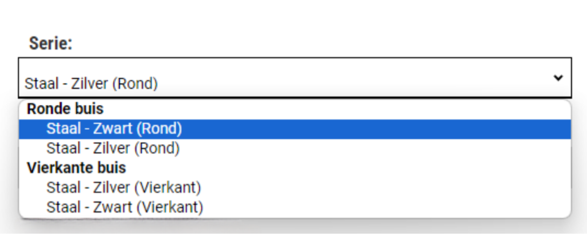 Met een serie kiezen bedoelen wij eigenlijk de kleur en het materiaal. Zo kun je meubels bestellen in staal zwart, staal zilver (ook wel gegalvaniseerd genoemd) of aluminium. Zit jouw serie er niet bij, dan kun je dit via de configurator aanpassen. Hier komen we later op terug bij het punt 'Open in 3D tool'. Bij ieder meubel hebben wij al de meest gekozen series toegevoegd.
