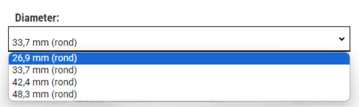 De diameter van de buizen en koppelingen kun je invoeren bij de optie 'Diameter'. Bij de meubels hebben we al rekening gehouden met de meest gekozen diameter. Bij een kledingrek kun je bijvoorbeeld niet groter kiezen dan 33,7mm, omdat er dan geen kledinghangers meer aan kunnen. Zo hebben we bij veel meubels al rekening gehouden met specifieke aanpassingen.
