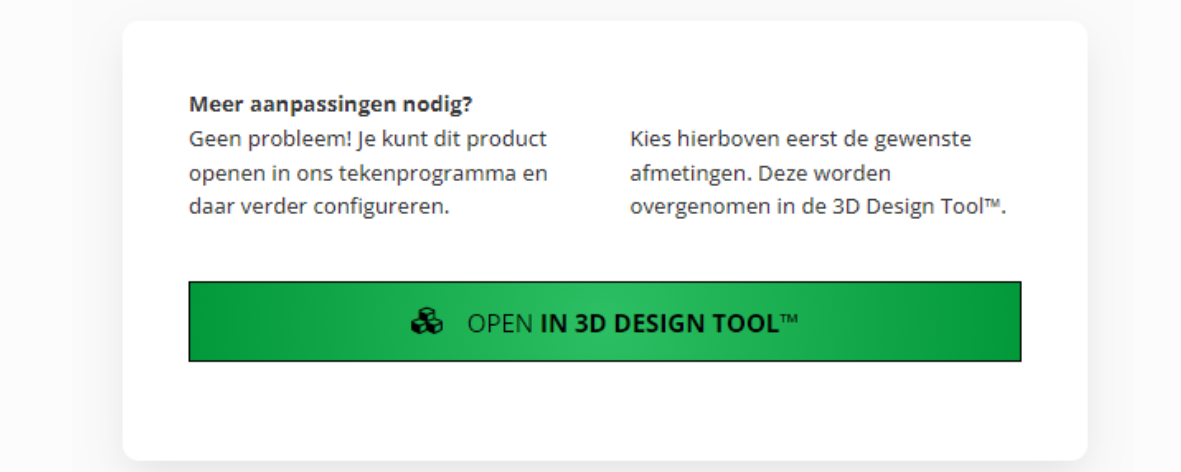 Meer aanpassingen nodig? Geen probleem! Je kunt dit product openen in ons tekenprogramma en daar verder configureren. Kies eerst de gewenste afmetingen. Deze worden overgenomen in de 3D Design Tool.