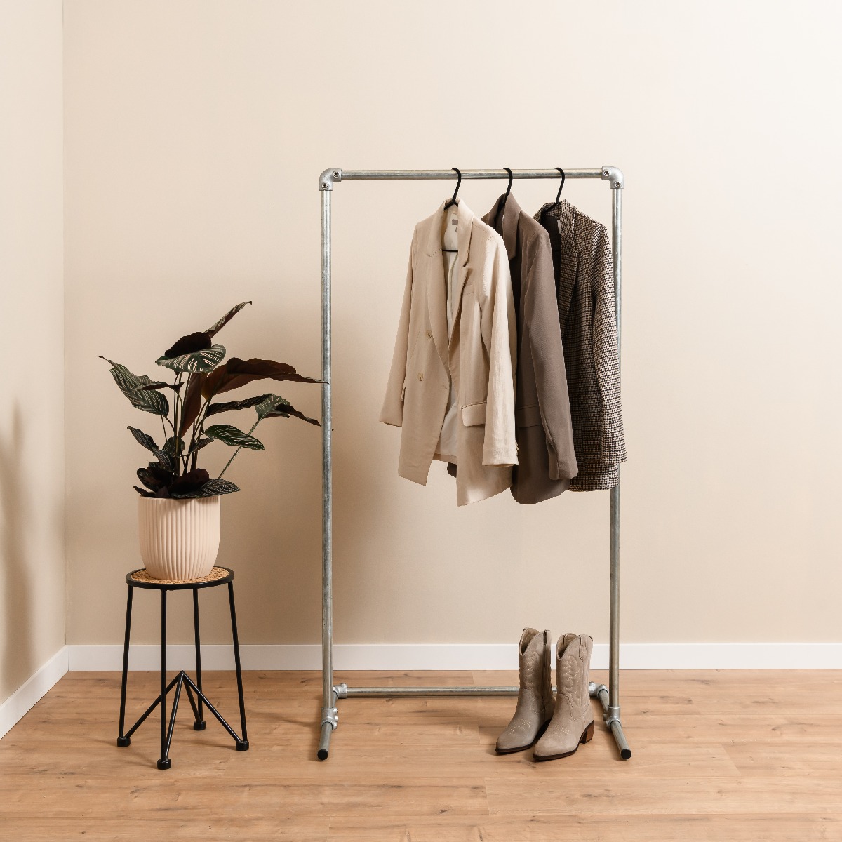 - Duurzaamheid: Steigerbuizen zijn gemaakt van hoogwaardig materiaal dat tegen een stootje kan, waardoor je kledingrek jarenlang meegaat.