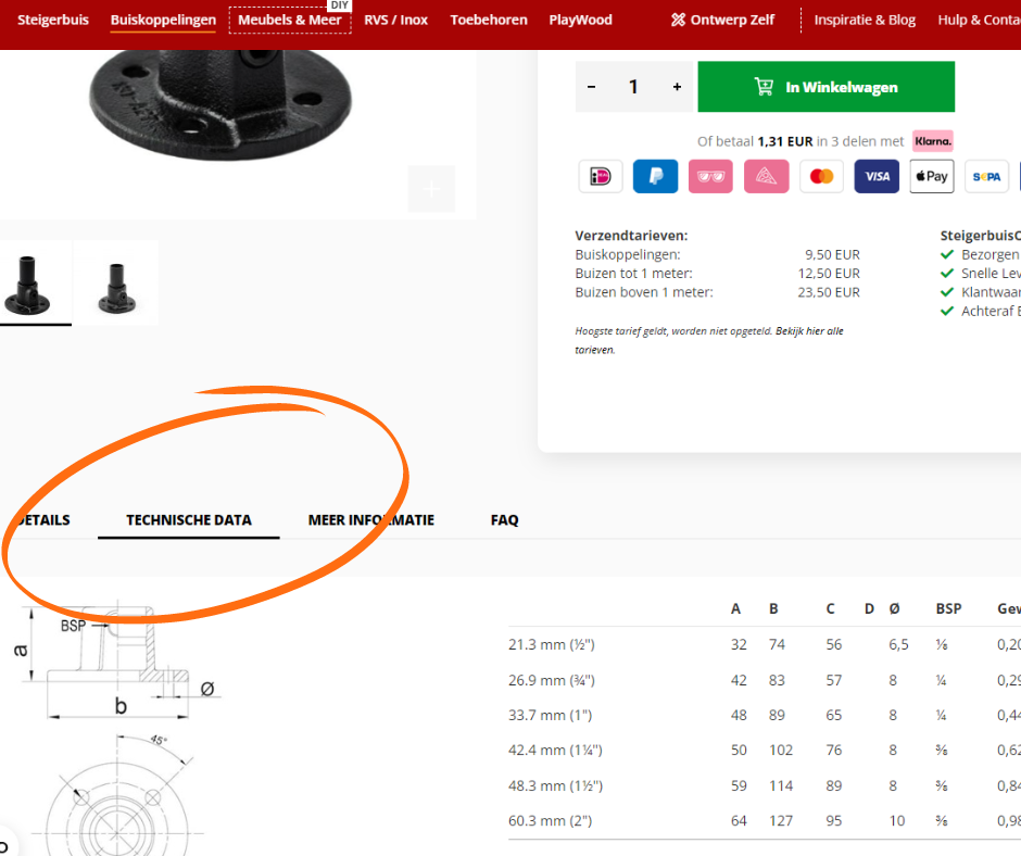 Wist je dat er bij de koppelingen ook technische tekeningen te bekijken zijn. Dus wil je weten hoeveel de flens uitsteekt bij een voetplaat, of wat de afstand is van hart tot einde koppeling, dit kan je per buiskoppeling vinden onder de "Technische data" (zie afbeelding).