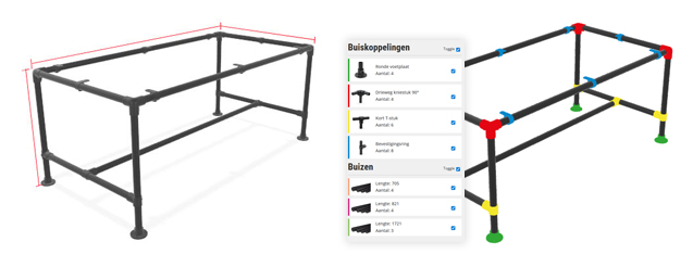 Bij het instellen van de maten werken wij altijd met de (globale) buitenmaten van de constructie. Voorbeeld: kies je bij een tafel een breedte van 2000 mm, dan wordt de uiteindelijke buitenmaat van de tafel ongeveer 2 meter. Wil je de binnenmaat berekenen? Trek dan tweemaal de gebruikte buisdiameter af van de opgegeven buitenmaat.