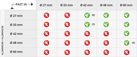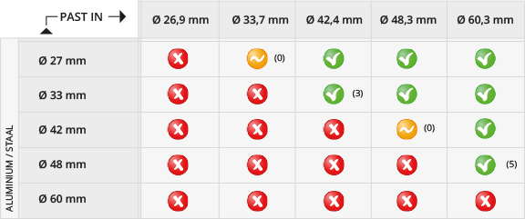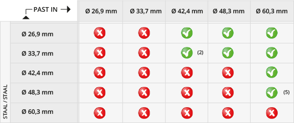 Of steigerbuizen in elkaar passen, hangt af van de diameter, het materiaal en de wanddikte van de buizen. Deze tabellen laten zien welke buismaten in elkaar schuiven en welke combinaties niet passend zijn. Let op: de opgegeven waarden zijn indicatief. Door productie- en materiaaltoleranties (zoals wanddikte, lasnaad en galvanisatie) kunnen de pasvormen iets afwijken. Er kunnen daarom geen rechten aan deze gegevens worden ontleend.